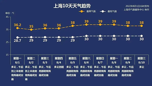 上海中心氣象臺2022年08月02日10時45分發布高溫黃色預警信號:受副熱帶高壓影響,預計本市中心城區以及寶山、嘉定、閔行、松江、青浦、浦東北部等地今天的最高氣溫將超過35℃,請做好防暑降溫工作。